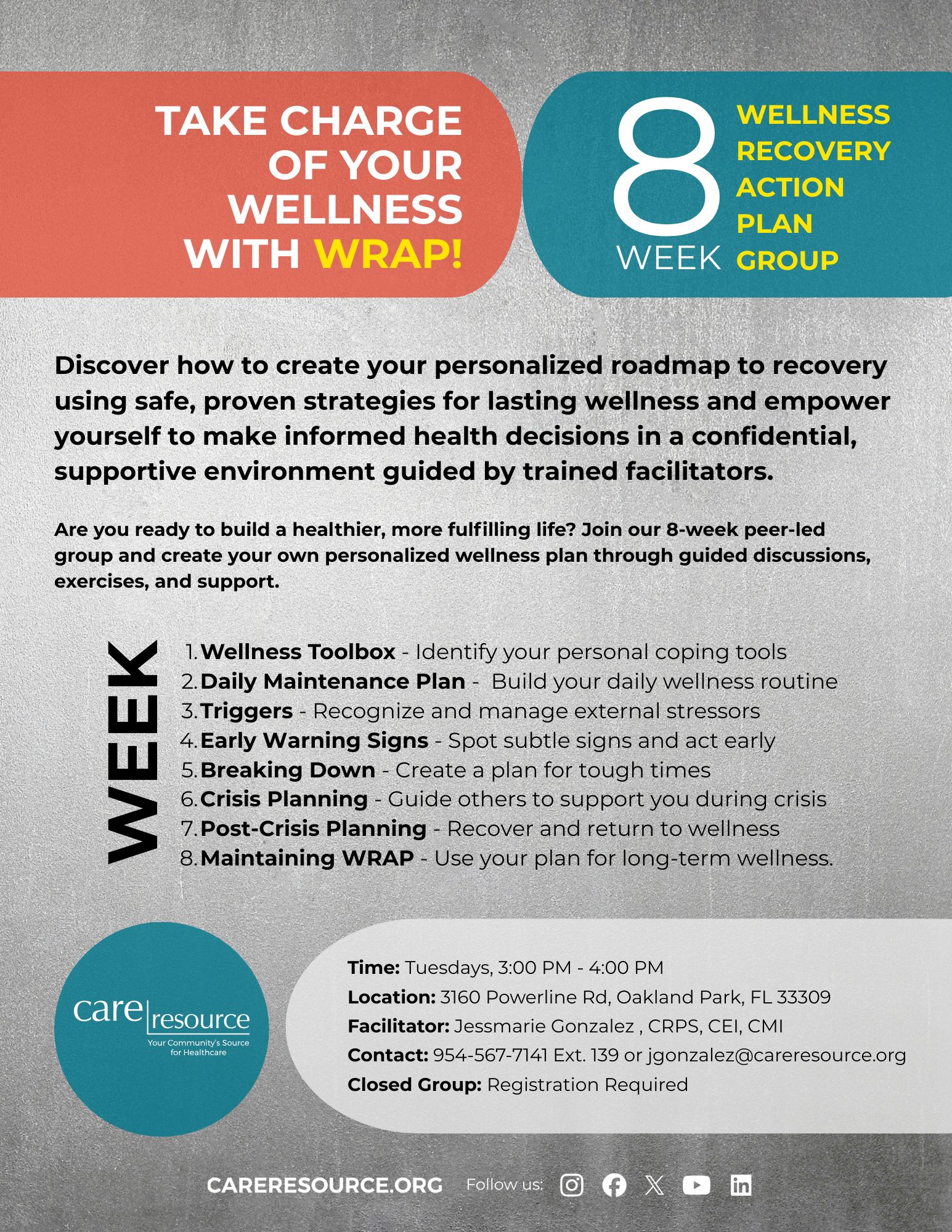 Información de contacto para el grupo: 954-567-7141 Ext. 181 o wflaxman@careresource.org