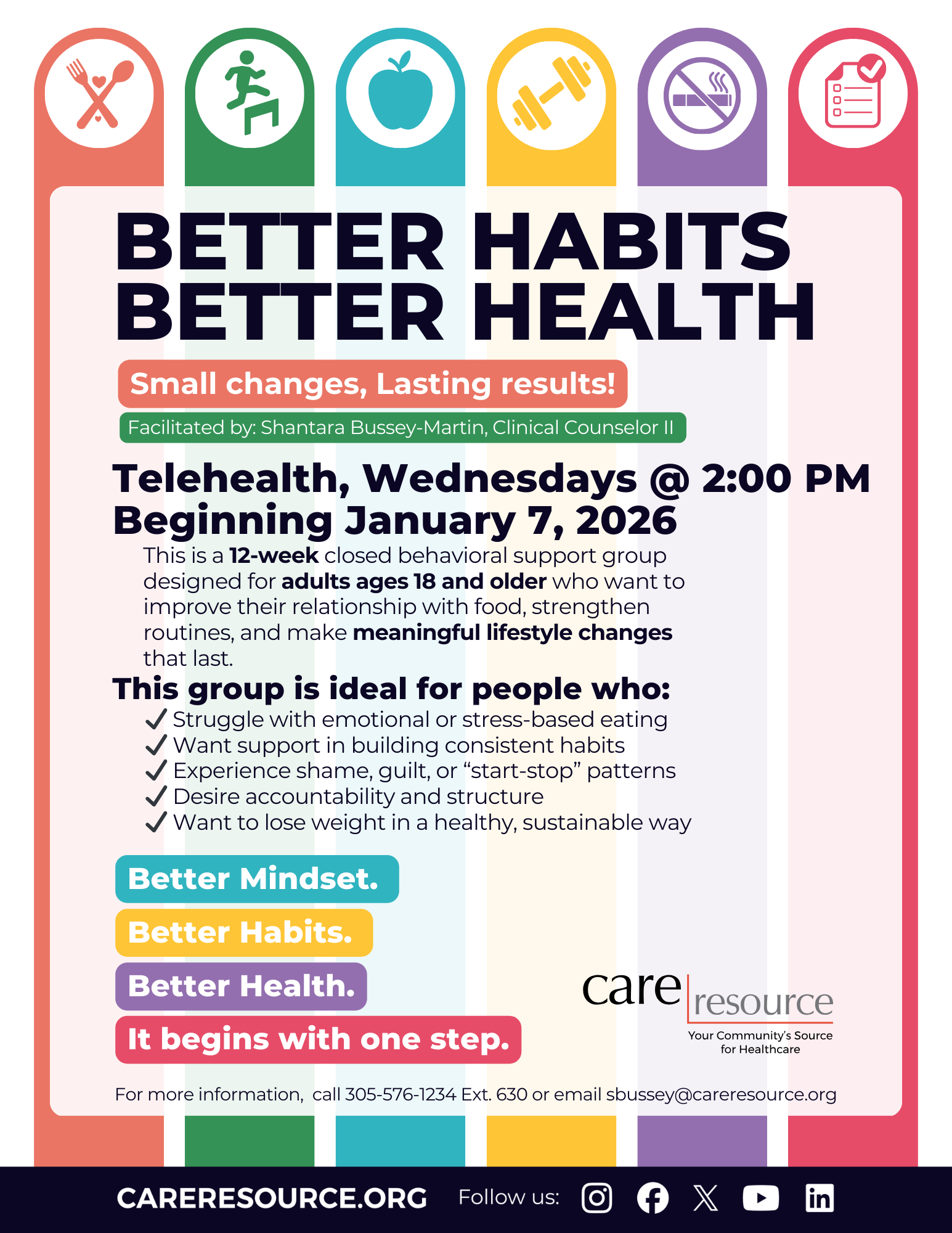 Contact Information for Group: 305-576-1234 Ext 630 or sbussey@careresource.org